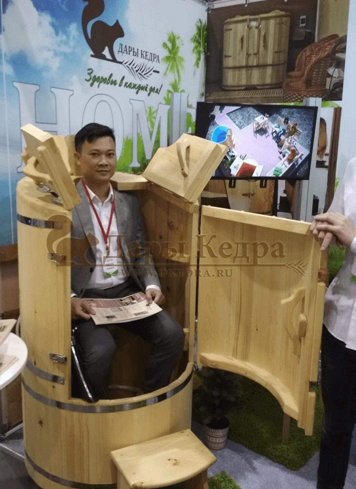 Двухместная фитобочка из кедра - это парная, в которой удобно принимать процедуры двум людям. Она оборудована откидными створками, дверцей, отверстием для головы и перегородкой (по желанию). Толщина стенок составляет 40-45 мм, что позволяет увеличить срок службы изделия. Во время парения человек находится внутри кедровой бочки, а голова снаружи. Благодаря этому исключается возможность перегрева. Подлокотники из кедра и внутренние ручки делают эксплуатацию фитобочки более удобной.
