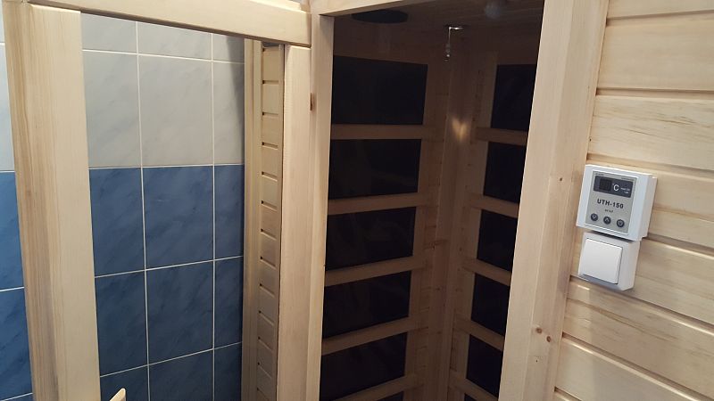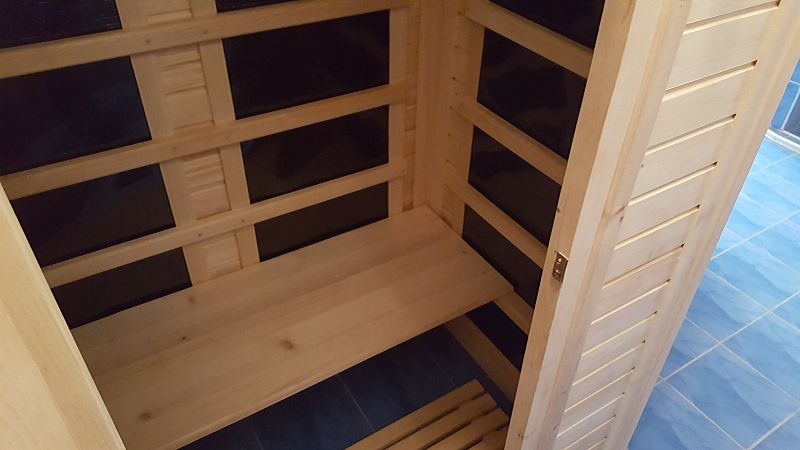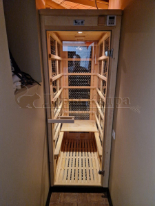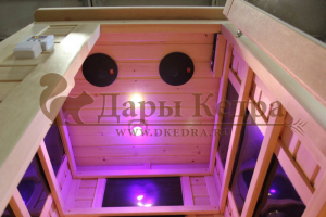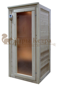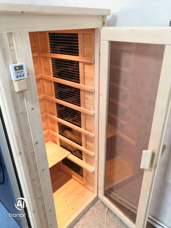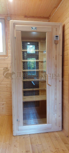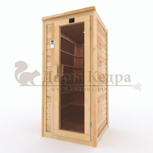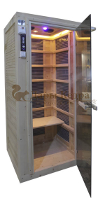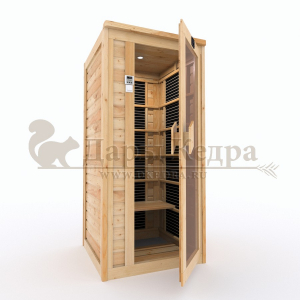 Это специально оборудованная кедровая кабина для прогрева тела человека сухим теплом. Воздух в таких парных не нагревается. Инфракрасные лучи воздействуют на тело, равномерно прогревая мышцы, суставы и органы. Карбоновые излучатели, встроенные в стены кабины, обладают мягким прогревом, что полностью исключает возможность ожога. Работает кабина за счет электричества. Компактная одноместная инфракрасная сауна с карбоновыми излучателями подойдет как для домашнего использования, так и для коммерции.